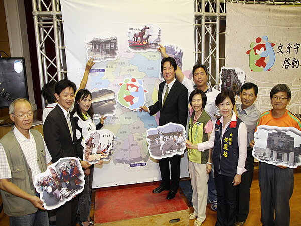 市府文化局文資處2日在市定古蹟原台南公會堂,舉行「台南市文化資產守護網」啟動儀式。出席的賴市長與文化局長葉澤山、文資處長林韋旭、市議員唐碧娥、林宜瑾、洪玉鳳、黃麗招等人一同進行拼圖儀式,將歸仁農會洋樓、楠西江家宋江陣、東山迎佛祖等南市境內的文化資產圖示,貼在台南地圖上,見證市府對文化資產守護的重視和決心。