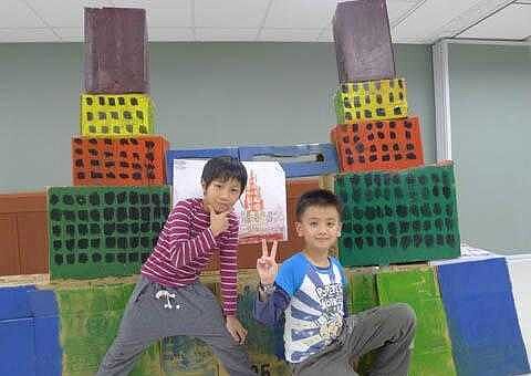 鹽埕的小朋友藉由紙箱堆疊遊戲,體驗如何將紙箱改造原本樣貌,變成有趣又可看的藝術作品。(圖/兒福中心提供)
