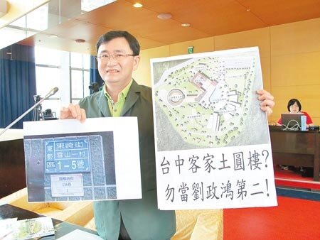 中市議員黃國書炮轟,客家土圓樓還未建,路名竟改成圓樓街,提醒市長胡志強「勿當劉政鴻第2」。(記者盧金足/攝影)