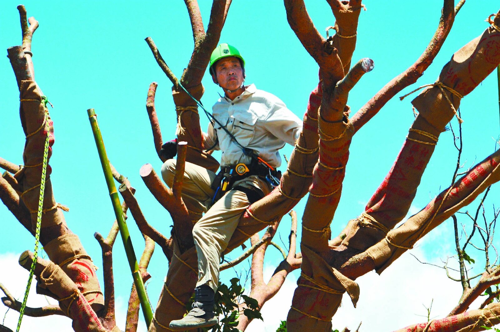 日本樹醫昨天為金城武樹義診,爬上樹觀看枝葉被破壞的情況。(記者施鴻基攝影)