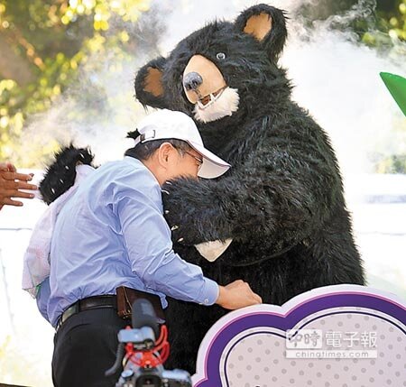 無黨籍台北市長候選人柯文哲登上花車,與扮演台灣黑熊的工作人員擁抱。