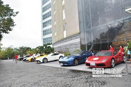 日月行館執行長丁稼蓁表示,精英超跑會聚的壯觀場面,出現在23日;近午,數以百計的法拉利跑車,分批列隊進入飯店地下室停車場,停滿了兩個樓層,部分則在門面一字排開,壯觀吸睛。
