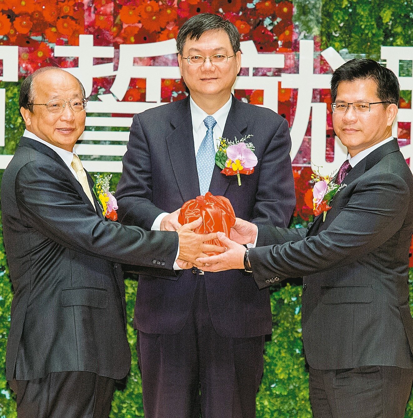 台中市新、舊任市長上午進行交接儀式,由政務委員杜紫軍(中)監交,台中市長胡志強(左)將印信交付給新任台中市長林佳龍(右)。(記者黃士航/攝影)