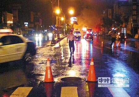 到場處理車禍的員警立即在人孔蓋旁擺上三角錐示警。