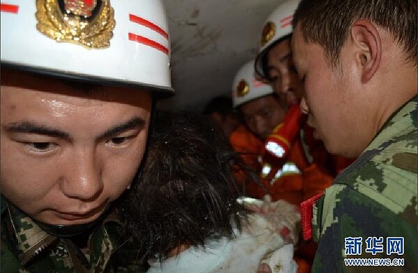 救難人員搶救受難人員,此外受到地震影響,供水管路受損嚴重,估計卅萬民眾用水受影響。(圖/翻攝自新華網)