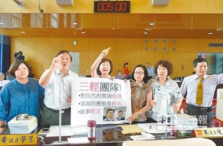市議員黃馨慧、李中、楊正中及朱暖英等人,要求市府副祕書長郭坤明到議會報告,針對日前在媒體投書,指議員缺乏國際觀要求「林佳龍道歉、郭坤明報告!」卻因郭出席「中彰投區域治理平台首長會議」,無法到場,引起藍營議員不滿。