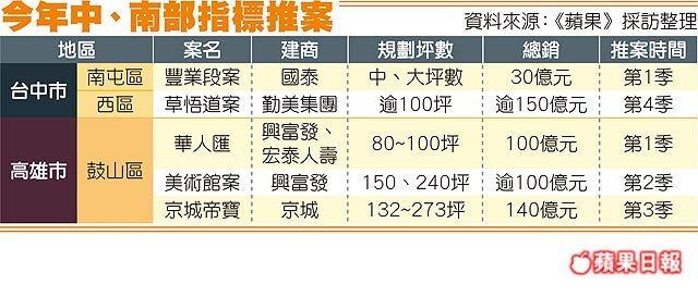 去年房市北冷南熱,今年建商看好中南部房市,在台中、高雄多推出換屋型、豪宅產品,不乏百億元指標大案。如年底勤美集團在台中將公開首個總銷逾150億元住宅;高雄鼓山區更有興富發與京城共推出3個百億元豪宅案。