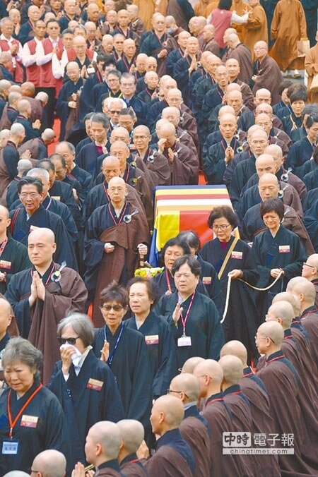 信眾跪送 達數公里中台禪寺副住持兼發言人見允和尚說,老和尚生前並無特別指示儀典怎麼辦理,僅教導弟子及信眾精進修行、利益大眾。法會結束後,僧眾及居士從大殿兩旁魚貫徐行,分跪路旁行頂禮,迎送惟覺老和尚聖龕;隊伍從佛堂延伸至山門、平雲山都飯店,長達數公里,不少人神情哀淒,甚至淚流不止,信眾高聲念著佛號,送老和尚最後一程。