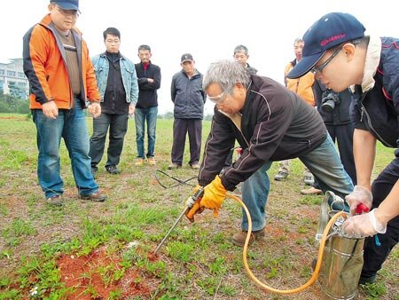 國家紅火蟻防治中心組長賴鴻寬昨率專家到林口文化二路及寶林路口的國中預定地,向農會產銷班代表示範如何稀釋「賽滅寧」後加入灌注器,再插入紅火蟻窩澆注,最後使用生長調節劑「百利普芬」,讓紅火蟻不要產卵、不再生長。