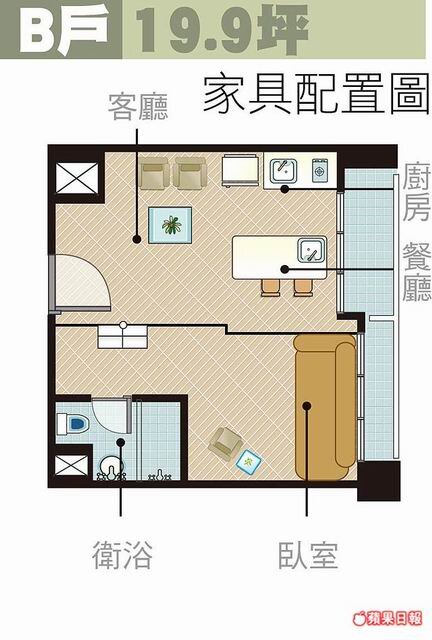 社區針對年輕族群規劃小坪數1房產品,單層4戶,室內採3米、4.2米複合式樓板讓空間運用更彈性、有設計感,住戶也可依需求規劃收納空間。格局部分,客廳、廚房和臥房皆為開放式空間,雖然視覺無遮蔽看起來較寬敞,但廚房的油煙可能因此飄至客廳、臥房而降低生活品質。