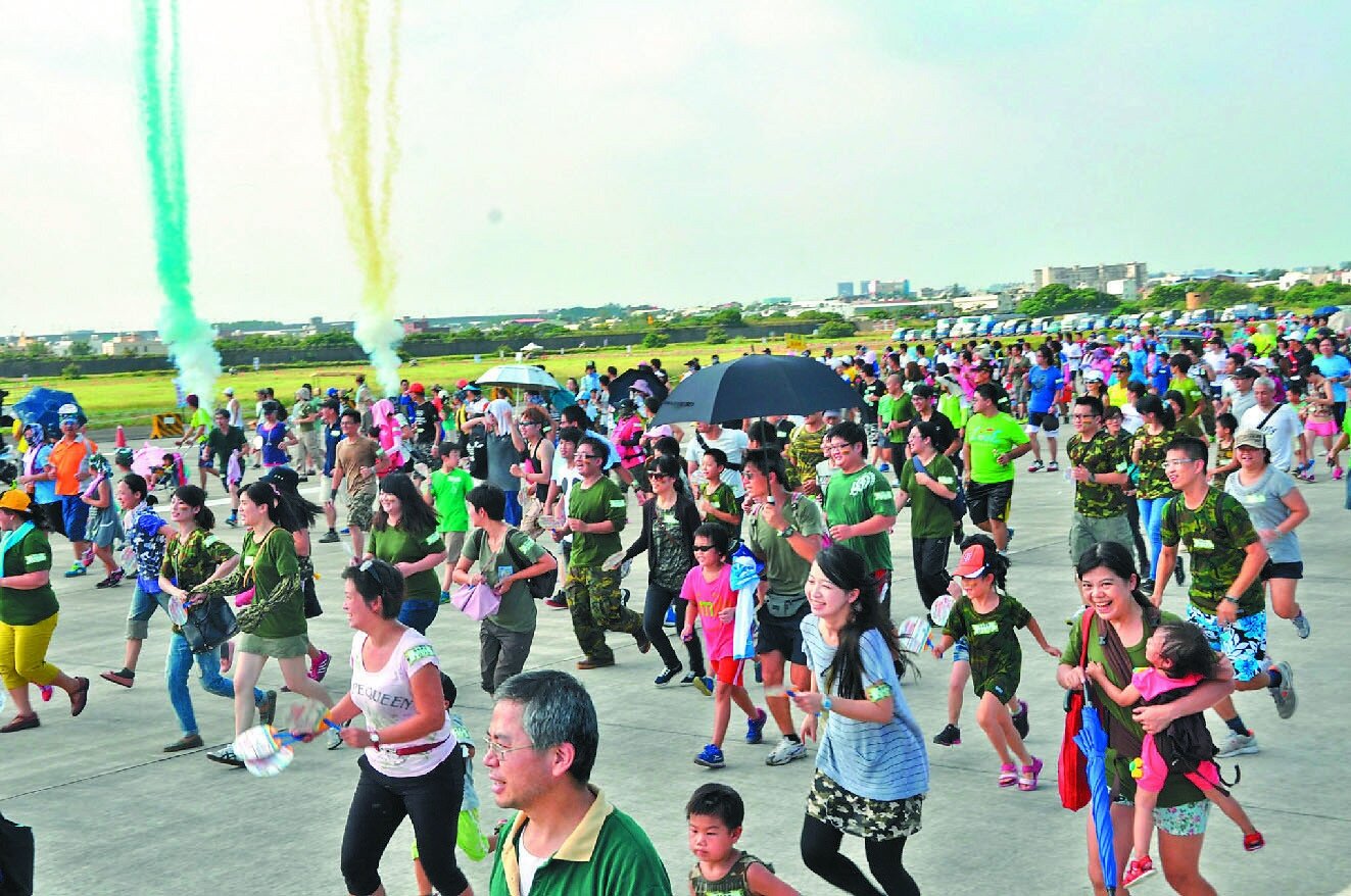 記者曾增勳/桃園報導在大園海軍基地舉行的桃園地景藝術節,昨天舉行「空襲路跑」活動,這是全台唯一在機場跑道進行的路跑。桃園地景藝術節,昨天舉行「空襲路跑」活動。(記者曾增勳/攝影)3000多人在伍佰「空襲警報」音樂聲中,邊走、邊玩輕鬆「路跑」。