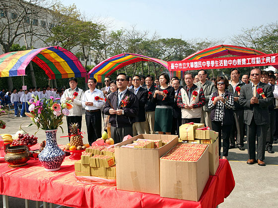 台中市大雅區大華國中創校18年,一直沒有活動中心,學生在艷陽高照或寒風刺骨下進行各項活動,在各界奔走下,活動中心新建工程27日動工,以後學生不用再風吹、日曬、雨淋,可以快樂學習。活動中心由國睦企業捐獻2500萬元,市府補助4200萬元,活動中心新建工程今(27)日動工,預計103年6月完工。