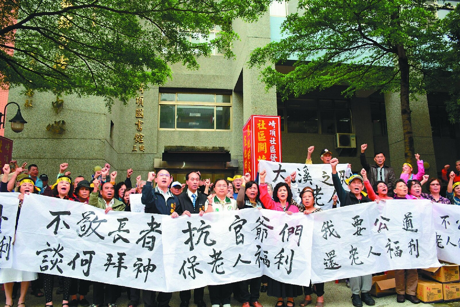 大溪長青老人會昨天到會館抗議,質疑鎮公所日前決定收會館租金是選舉恩怨。鎮長黃睿松則回應絕無此事,乃因縣府新規定。(記者賴佑維/攝影)