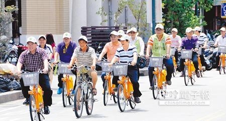 彰化市長邱建富(左一)昨日一馬當先,率市代、里長等人騎UBike遊市區。(記者洪璧珍/攝影)