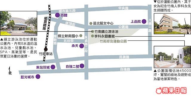 苗北藝文中心正對45000坪的竹南綜合運動公園,公園內設有鎮立游泳池、李科永紀念圖書館,休閒活動選擇多元;日常採買、飲食可至竹南車站前站商圈或建國路商圈,車程5~10分鐘;開車族可由頭份交流道銜接國道1號,或由西濱交流道連接西濱快速道路或國道3號,交通便利。