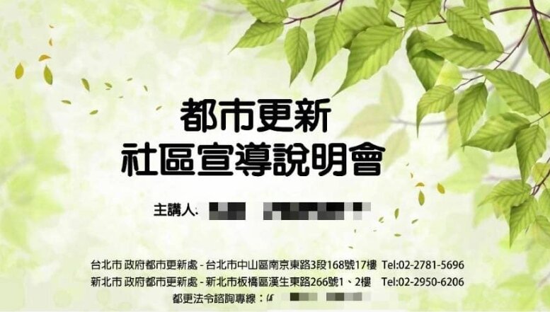 不過,近期卻接連有3位民眾,遇到不明人士出示「都市更新推動人員」的證件,並召開都更說明會,不只在簡報中,把台北市政府都市更新處列名,甚至以話術誘導居民簽下都更同意書,而有疑慮的民眾未簽下同意書,對方還挨家挨戶的遊說拜訪,已造成居民困擾。