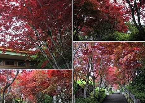 時值四月天,太平山莊中央階梯兩側的紫葉槭,頂著密密麻麻的新葉,熱情迎接每位賓客的到來。當陽光露臉,更是照得片片火紅,人們置身其中,彷如走在秋的楓紅世界,如詩如畫,實為人生一大享受哩!