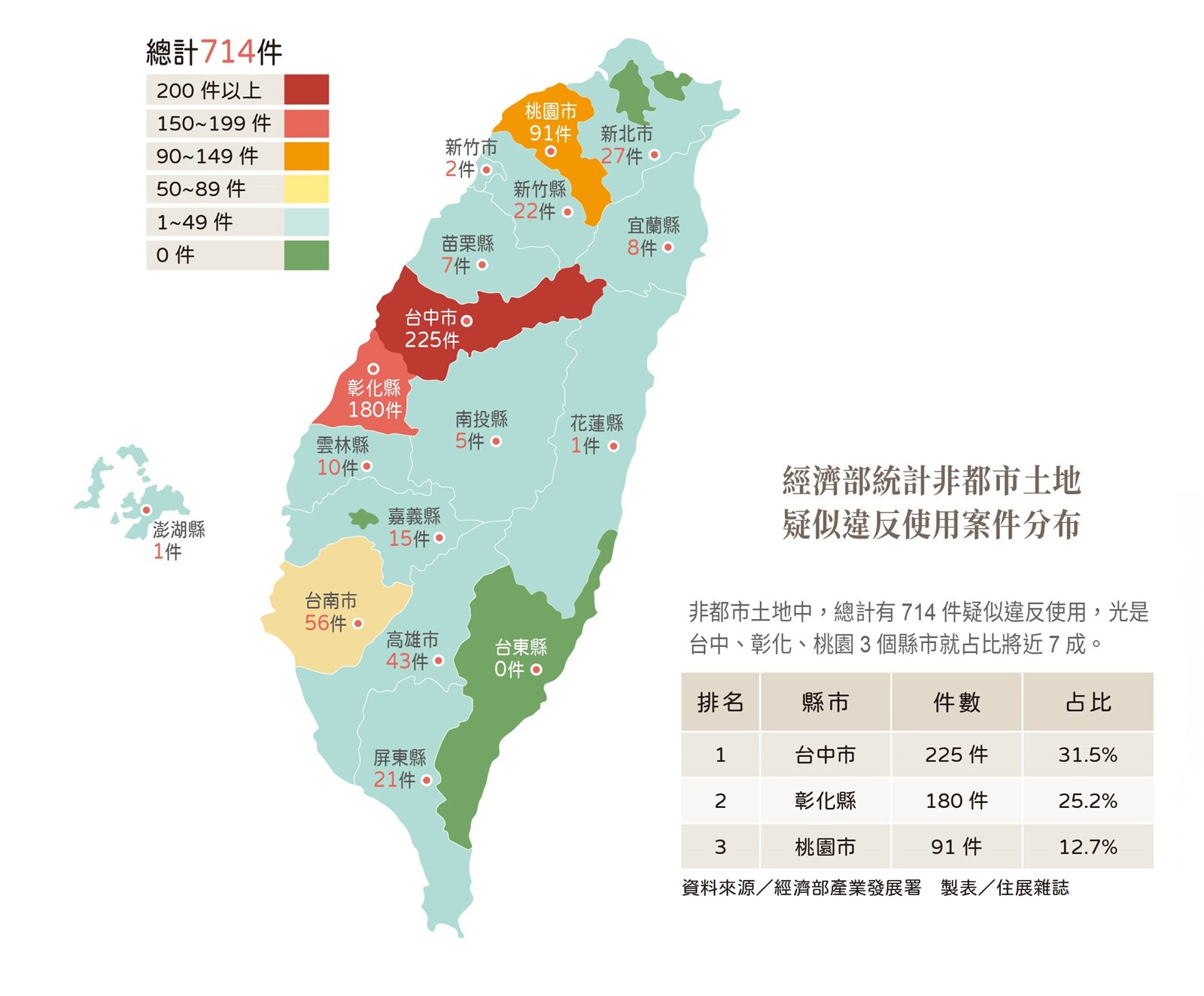 經濟部則公布各縣市疑似違反土地使用查處名單,自2020年起截至去年十月底,非都市土地案件累計714件,以台中市225件最多,占比超過三成;接著依序是彰化縣180件、桃園市91件、台南市56件,與高雄市43件,該五縣市即占比83%。