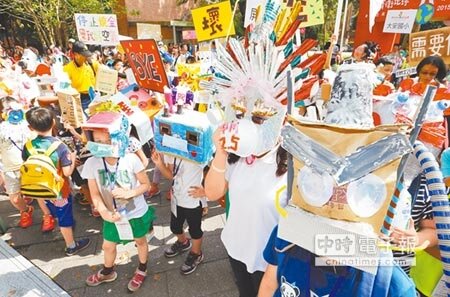 「空汙掰掰,我的未來我來救!」來自全台灣北中南10所小學、300名國小學童,昨天戴上自製的創意防毒面具,走上街頭。調查指出,近9成小朋友認為,擊退空汙人人有責,也提出十大行動方案,呼籲多搭大眾交通工具、多種樹、少抽菸,打擊看不見的「空汙怪獸」PM2.5。