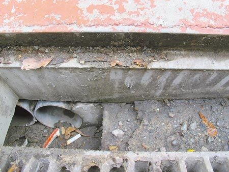 為找出淹水原因,蘇淑芳打開漢生東路水溝蓋查看,竟發現排水管線多有破損,不僅有凹陷、破裂,本應有3管的排水管,竟只有2管,一旁被水泥整片堵住,質疑市府承包商偷工減料,根本就是「假水溝」。