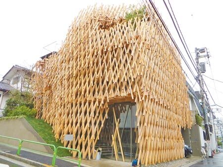 「微熱山丘」進駐東京表參道,店面由日本名建築師隈研吾設計,造型奇特的木條交錯建築物相當吸睛。(黃菁菁攝)