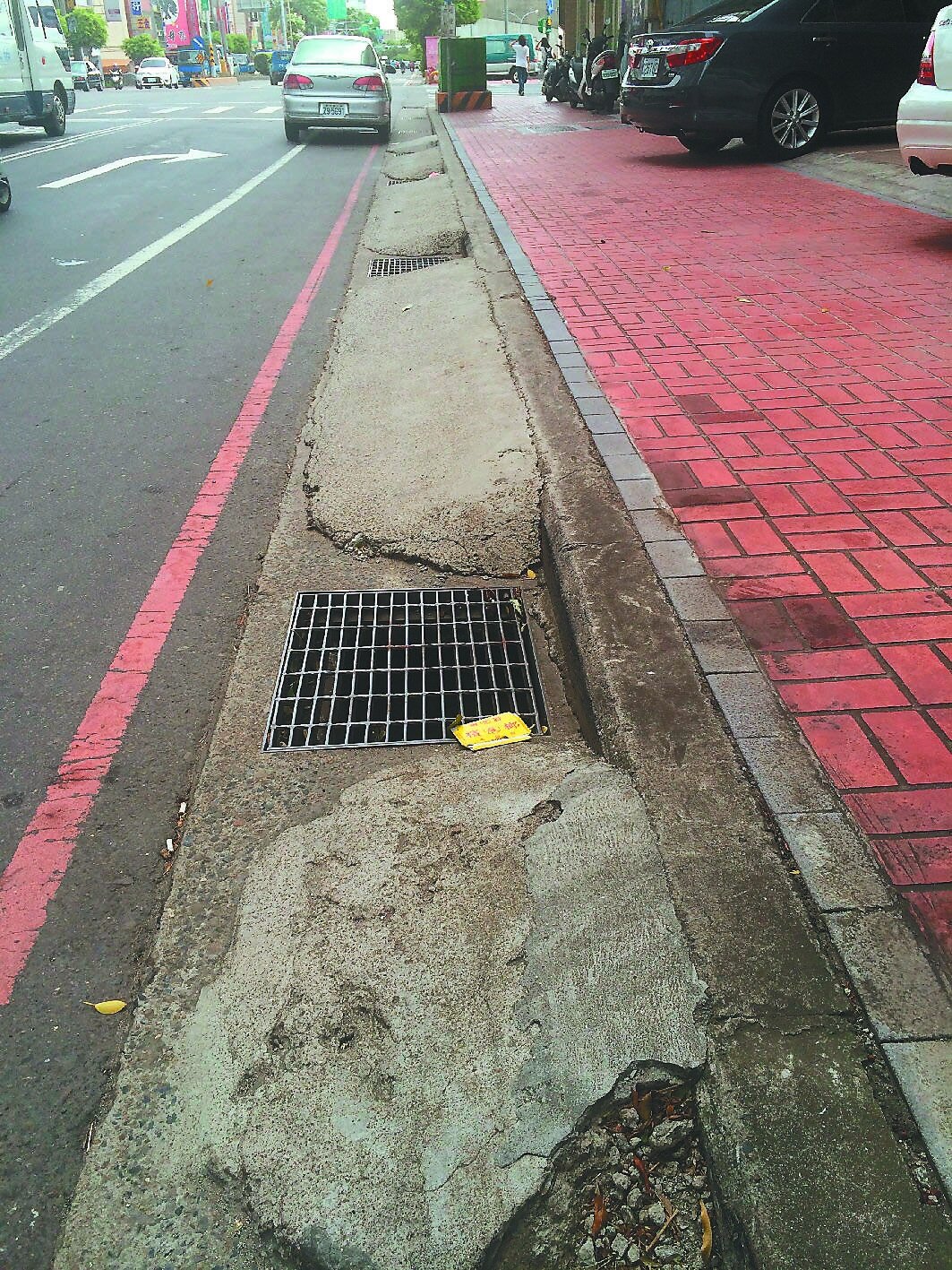 中壢市的中華路、環北路車水馬龍,為求安全多半人車分離設有人行道,1樓許多銀行或商家店面,業者為讓民眾購物、洽公方便,多半會讓大家把機車騎上騎樓或門口暫放,車輛來來往往,都從人行紅磚道邊的鐵板及水泥邊坡穿梭,明顯可看見東一塊、西一塊的水泥邊坡,有些還有破洞,小石子遍布。