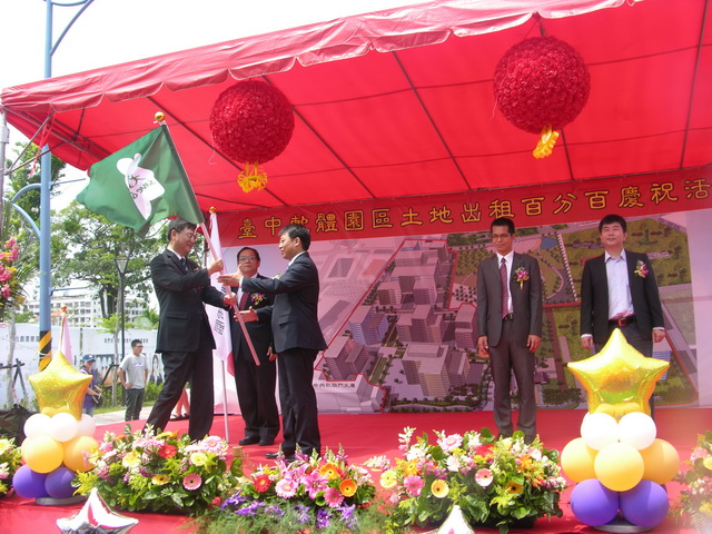 台中軟體園區招商百分百,14日上午舉行慶祝活動,由經濟部次長杜紫軍授旗給進駐廠商,杜紫軍說,軟體園區年產值達一百五十億,有五千個就業機會,台中市長胡志強則表示,軟體園區他提出時,不被看好,甚至說是選舉抄作,如今中央一年就核准,效率高,市府會作好週邊交通建設。