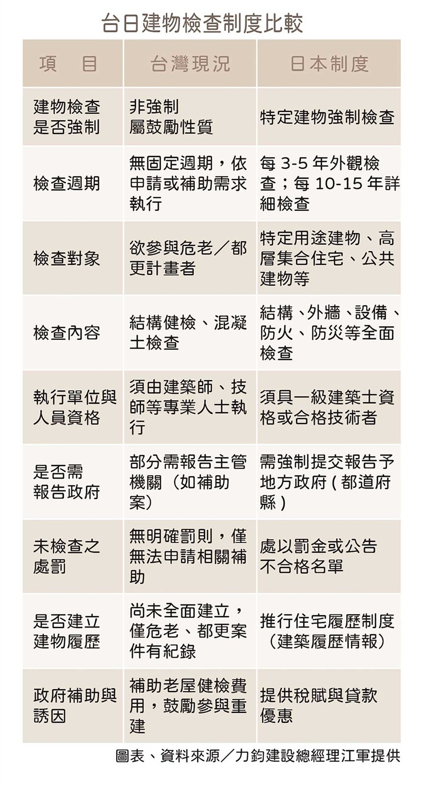 對於如何建立更具體與可執行的制度架構,產業界也提出了更具體的參考建議。長期關注日本耐震制度的力鈞建設總經理江軍建議,台灣可參考日本推動「強制性老屋體檢制度」,針對屋齡30年以上的集合住宅與公共使用建物,導入定期結構檢查,並透過補助、稅賦減免等誘因,鼓勵屋主進行耐震補強與外牆更新。