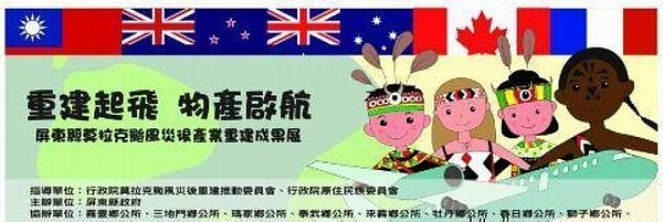 98年莫拉克颱風重創屏東原鄉,歷經四年的重建及輔導,屏東縣政府9月7日下午5時在高雄港區舉辦「莫拉克颱風災後重建區-產業重建輔導成果展售會」活動,將重建區內精湛的原住民手工藝、優質農特產品以及最新研發出來的伴手禮等,藉由記者會發表,並辦理展售,期望能增加屏東原鄉重建區的知名度及帶動產業行銷。
