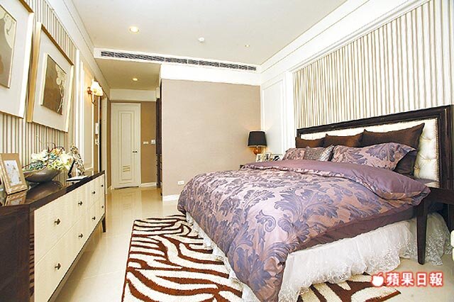 主臥室於牆面貼上紫藕色壁紙,及搭配線板,符合輕古典風格更增添層次感,主臥更衣室部分,以仿鋼烤的油漆和霧面的木皮貼片搭配,保留家具的質感。次主臥可作為孝親房使用,電視櫃設計也頗具巧思,同時兼具衣櫃與收納功能。