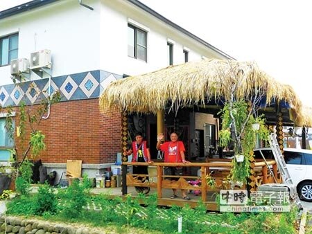 歡迎來坐來自茶山的莊家兄弟搭建傳統茅草分享涼亭,將茶山文化延伸至永久屋。(王瑄琪攝)
