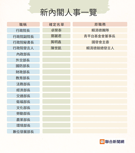 聯合新聞網/綜合報導 總統當選人賴清德將於5月20日上任,首任內閣人事也持續布局中,賴清德已於10日上午公布首波內閣名單,預估其他內閣人事也將陸續出爐。 行政院長確定由呼聲最高的民進黨前主席卓榮泰接棒,青平台基金會董事長鄭麗君任副行政院長,行政院秘書長為龔明鑫、行政院發言人為陳世凱。總統當選人賴清德正式宣布,由民進黨前主席卓榮泰出任520後新任行政院長。記者杜建重/攝影總統當選人賴清德正式宣布,由民進黨前主席卓榮泰(左二)出任520後新任行政院長,搭配青平台基金會董事長鄭麗君(右二)出任副閣揆,準行政院秘書長為龔明鑫(左一)、準行政院發言人為陳世凱(右一)。記者季相儒/攝影新內閣人事