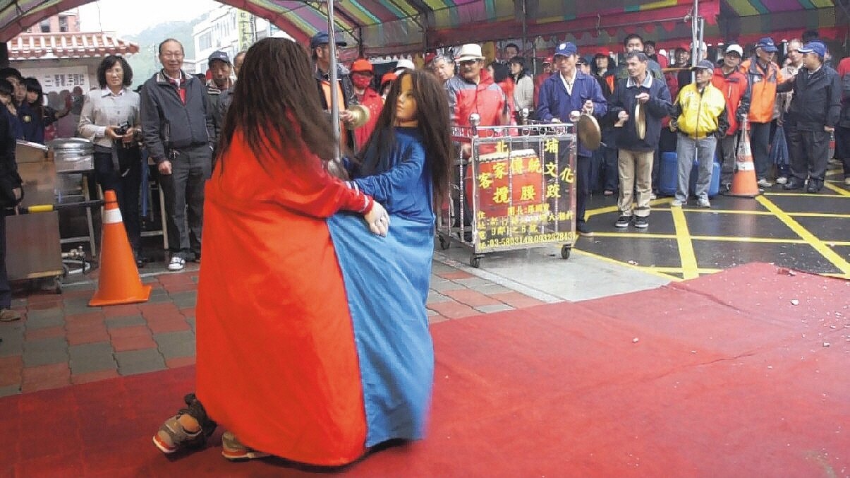 日漸式微的古早客庄慶典活動「攬腰跤」,由一個人套上連身假人道具,半蹲姿勢表演「摔跤」,逗趣又好看。(記者蔡昕穎攝影)