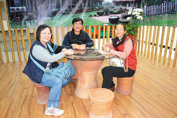 「紅磚赤瓦展」展出居廣陶負責人陳世紘(中)用磚燒陶管及缸,做為椅子及桌子。 (圖/鄭惠仁攝)