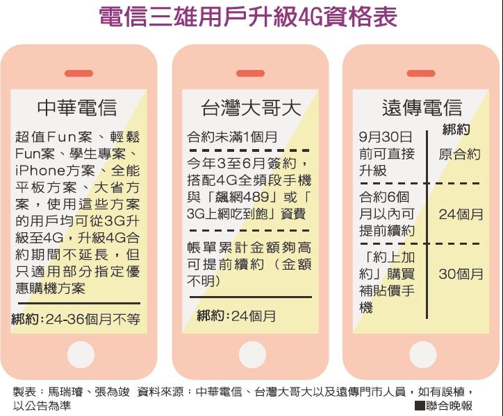 4G開台,不少人到了門市之後才發現,原來升級有諸多限制。中華電信規定用戶「必須搭配指定購機優惠方案」才能升級4G服務。台灣大哥大則會檢視「合約方案及是否擁有4G全頻段手機」兩項條件,用戶必須符合規定才能升級。電信三雄中,只有遠傳對既有用戶升級4G較無設限,9月30日之前都可以直接升級4G。