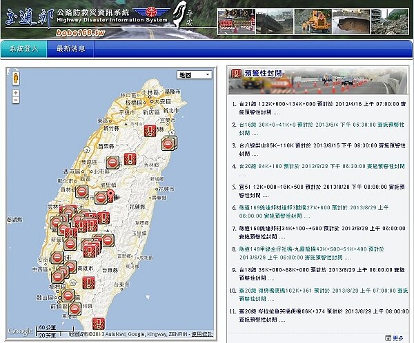 民眾出發前可至警廣交通網http://rtr.pbs.gov.tw/realtime/RoadAll.php、公路防救災資訊系統http://bobe168.tw/及公路防災特報http://www.thb.gov.tw/tm/wcf.aspx或各電視媒體新聞跑馬燈查閱相關公路通阻訊息,並於行經沿海或山區路段時小心通行。