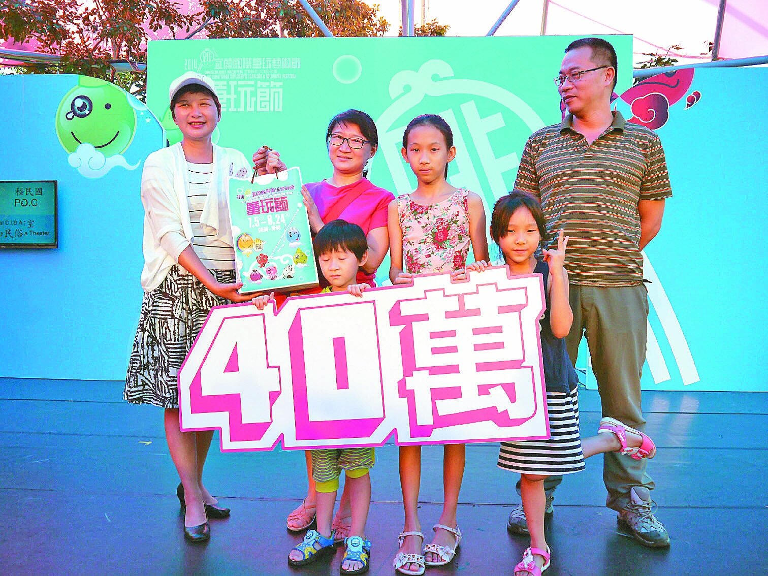 宜蘭童玩節進入倒數10天,昨天上午9點10分出現第40萬名遊客,來自新北市新店區的朱昌華、蘇雅萍一家駕車購票入園時,得知成了第40萬人次遊客,驚喜地說,「很驚訝!」