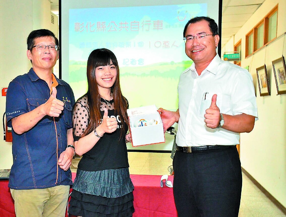 彰化縣租借YouBike達10萬人次,第十萬人次的租借人葉珮玟(中)接受縣府城觀處長游文祥(右)贈送禮物。(記者簡慧珍攝影)