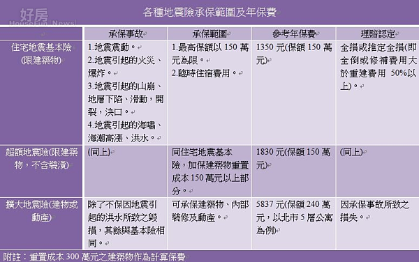各種地震險承保範圍及年保費一覽表。(圖/好房資料中心)