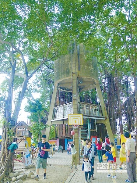 台南市二空樹屋旁、超過一甲子的大水塔,如今成為涼亭,吸引許多大小朋友前來感受眷村氣息。