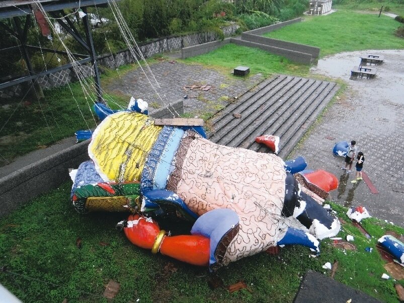 朝天宮表示,塑像是保麗龍材質,雖用纜線拉緊保護,但仍難敵強風,將由董事會討論,不排除把另一尊順風耳一併拆下,以保安全。