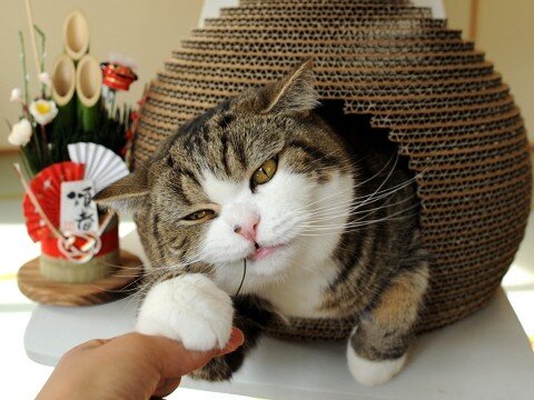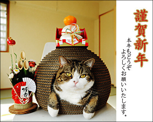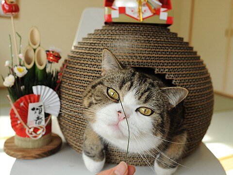 日本超人氣「紙箱貓」小圓(Maru) 在部落格拜年,主人順應牠喜歡窩在紙箱的天性,特製一個像蜂窩般鏡餅(日本年糕)造型的紙箱,再擺上應景的竹、扇的裝飾,還讓Maru 吃草,非常有年節氣氛!