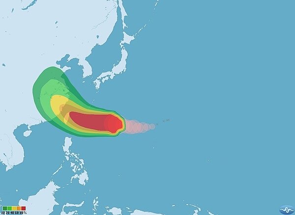 蘇力來襲,桃園縣府緊急召開防颱會報(圖/颱風七級風暴風圈侵襲機率圖/氣象局)