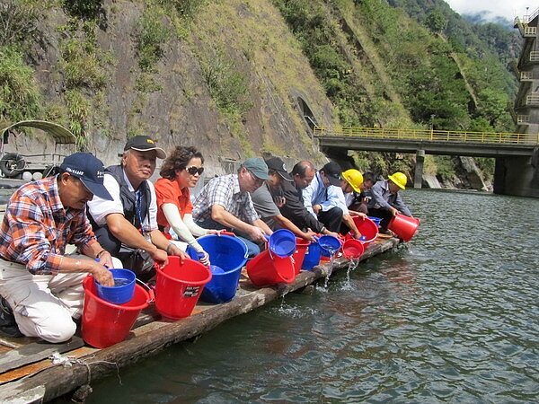 大甲溪發電廠在德基水庫舉辦魚苗放流活動,邀集地方各界人士與學童共放流三萬尾鰱魚苗。(圖/大甲溪發電廠提供)