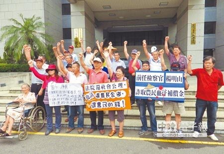清水合作農場農民昨天到台中地院前,拉起「還農民公道、還農民的錢」、「前任檢察官楊明山,詐取農民血汗補償金」等海報;現場還有70多歲農民坐著輪椅到場。