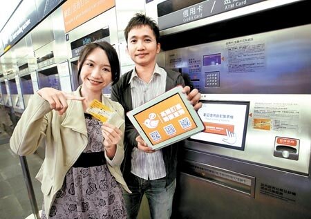 黃歆舟(右)常搭高鐵早鳥南下追求孫曼芸,勤快的奔波也打動美人芳心。黃歆舟開心秀出互換票平台設計的APP介面。(記者陳信翰/攝影)