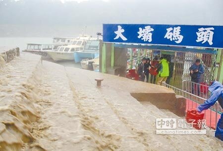 嘩啦嘩啦滾滾入庫桃園地區23日降雨,桃園石門水庫中午一陣驟雨,大壩碼頭階梯滾滾流水流入水庫。(林駿剛攝)