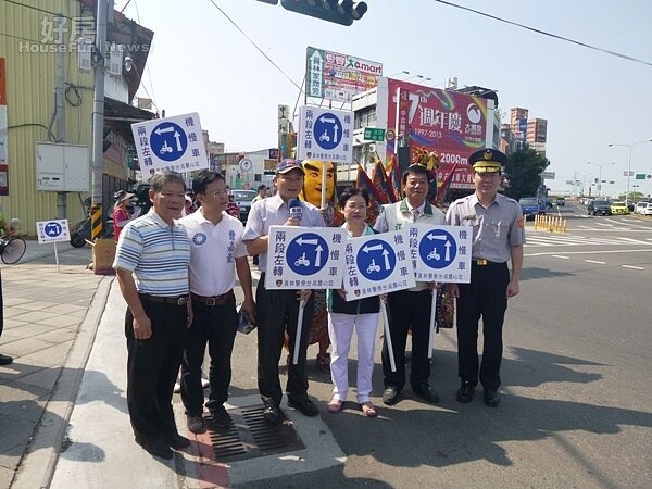 彰化縣員林鎮30公尺外環道正式通車後,中山路、莒光路等大路口車流量大,危險度提升,員林鎮長張錦昆、員林警分局長賈立民等人,5日上午出動電音三太子站路口舉牌宣導「機車應二段式左轉」,多數騎士都還霧煞煞,賈立民說,最近會持續加強宣導,希望民眾能建立正確駕駛習慣。