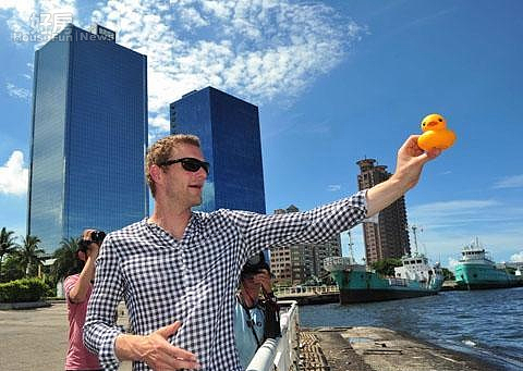 「黃色小鴨(Rubber Duck)來台首站將於9月19日至10月20日在高雄光榮碼頭展出,荷蘭藉設計者霍夫曼6日前往光榮碼頭勘查場地,霍夫曼表示,經過初步勘查並考量遊客觀賞角度,黃色小鴨將朝向光榮碼頭入口的方向展示,讓所有遊客都可看到不同面向的黃色小鴨。他非常期待下午能到美濃親手繪畫紙傘與製作美濃窯,與高雄在地的藝術創作者做跨國際的藝術交流,希望激盪出不同的火花。