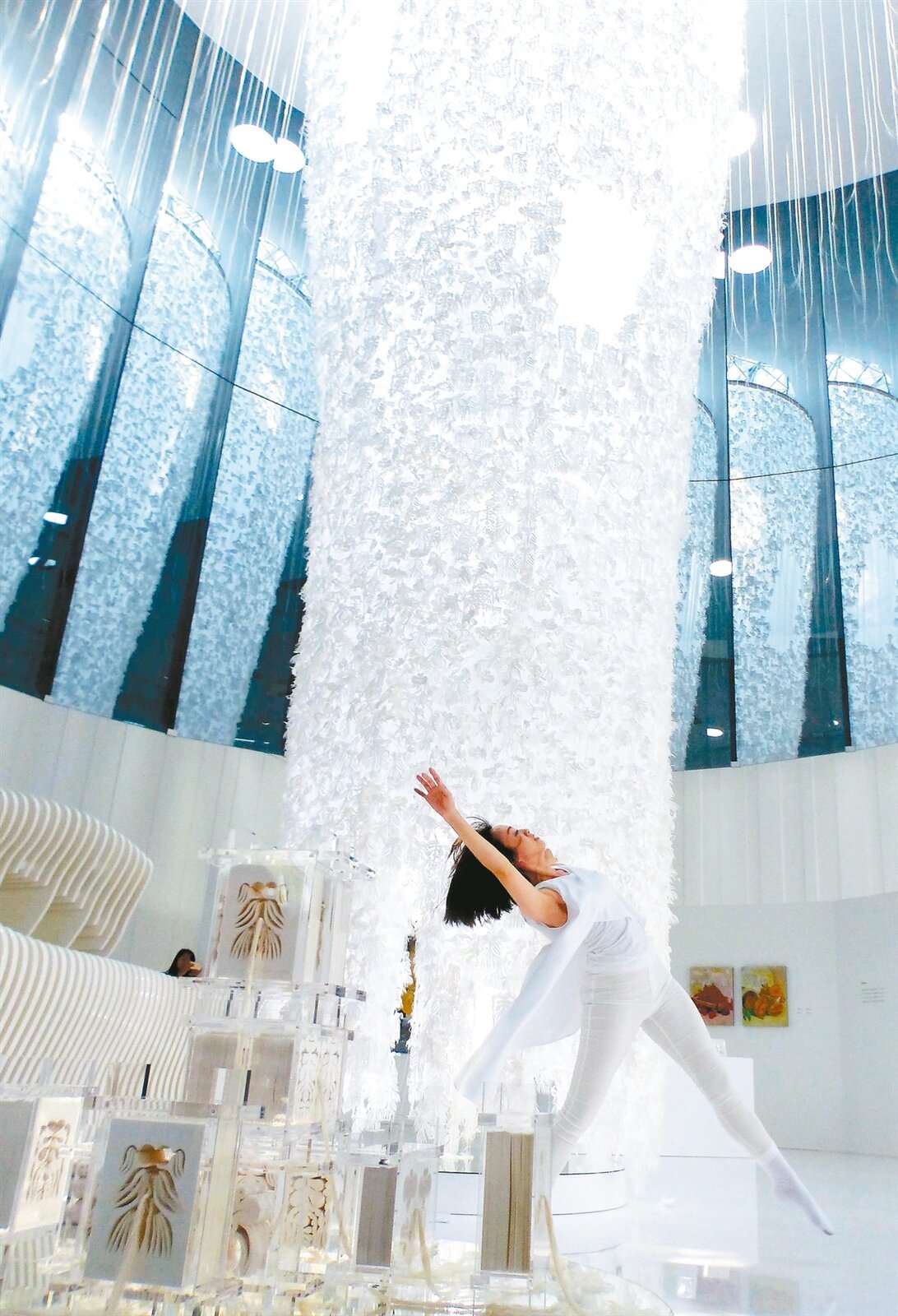 曾以巨型紙雕現身米蘭、紐約的台灣藝術創作者邱雨玟展出「水姑娘的繁衍計畫」紙雕作品,如飛瀑般從11公尺高處傾瀉而下,相當吸睛。